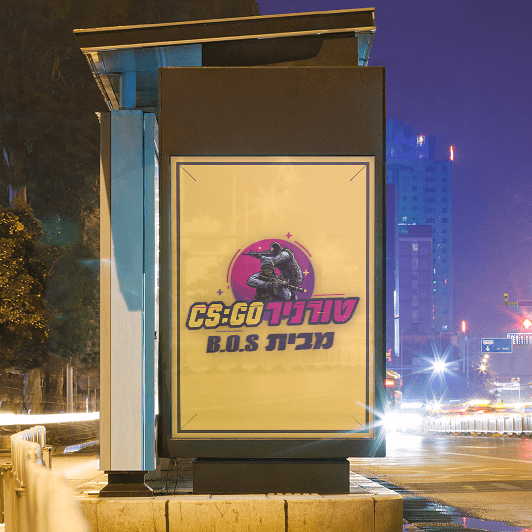 עיצוב פוסטר להכרזה על טורניר CS:GO בחסות BOS. סגנון אורבני ובועט שמושך תשומת לב ומדגיש את האדרנלין של עולם הגיימינג.